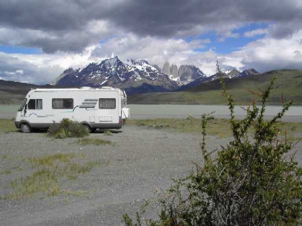Wir fahren die Rüttelpiste weiter bis zum Nationalparkeingang an der Laguna Amarga. Dort treffen wir Doretha und Hermann aus dem Schwabenlande, welche auch mit einem großen WoMo unterwegs sind. Das Wetter hat sich verschlechtert - ab und zu tröpfelt es. Wir erfahren, daß die Bedingungen für eine Fahrt mit unserem Auto in den Park nicht besonders sind - hier ist mehr für Rucksacktouristen getan - wir sind verwöhnt vom NP "Glaciares am Fitzroy". Für eine kleine Wanderung lohnt der hohe Eintrittspreis nicht - Campingplatz gibt es für uns nur einen - der liegt sehr ungünstig und freies Übernachten ist verboten - und außerdem ist schlechtes Wetter im Anzug. Wir beschließen erst einmal außerhalb des Parkes am Ufer der Laguna Amarga mit Blick auf den "Torre" unsere Zelte aufzuschlagen und verbringen mit Dorethea und Hermann den Abend bei einer Flasche "Rotem". Auf dem See sind etwa 50 Flamingos und um den See an den Berghängen grasen Guanacos mit vielen Jungtieren. Sie kommen tagsüber nahe zum Auto heran. |