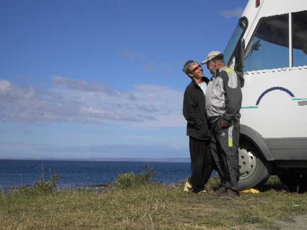 Nachdem wir in P. Arenas unseren Großeinkauf getätigt und 2 große dunkle Brote gebacken haben, geht es weiter an der Magellanstraße entlang auf der Rute 9 zum südlichsten Punkt der Magellanstraße. Zunächst fahren wir viele Kilometer auf einer Betonstraße. Nach etwa 26 km biegen wir rechts ab auf eine Piste und wollen in den Forestal Laguna Parrillar. Dort hoffen wir auf ein schönes Plätzchen für die Feiertage an einem See. Leider verlangt man für den Eintritt in das Reserva und das Übernachten so viel, daß wir auf dem Absatz kehrt machen. Es geht nun noch weiter bis P. del Hambre - vorbei an einen Monolithen, welcher bekunden soll, daß hier die geographische Mitte Chiles sein soll - vom Südpol bis zur peruanischen Grenze (ganz schön frech - nicht?). Noch 2 km bis zu unserem Weihnachts-Stellplatz - ein schönes Plätzchen direkt an der Magellanstraße. |