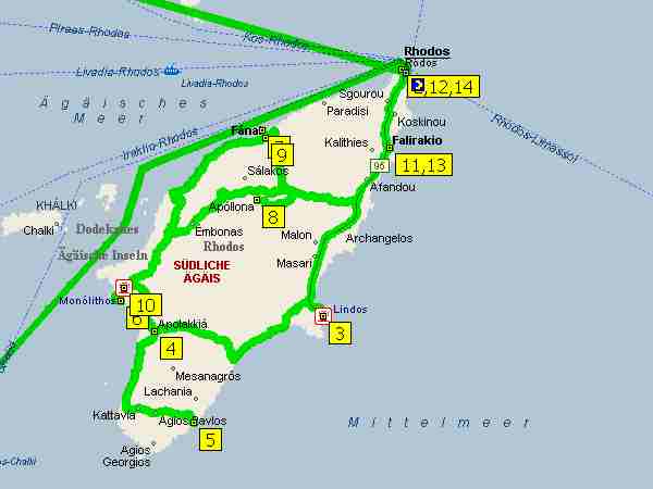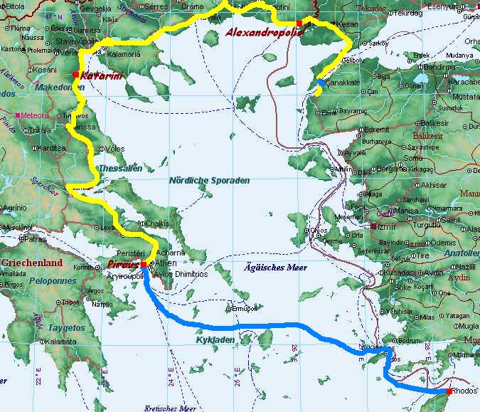 Den direkten Weg in die Türkei (mit der Fähre von Rhodos über Marmaris) können wir leider vergessen und so fahren wir zum und über das griechische Festland. Man glaubt es kaum: kostenmäßig ist uns dieser Entschluß leicht gefallen, denn der weite Weg per Fähre nach Piräus ist nur geringfügig höher, als der Katzensprung von Rhodos nach Marmaris (!). |