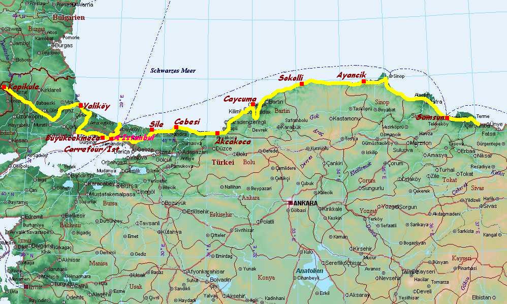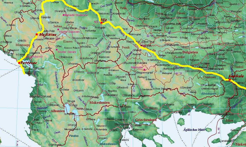 Eigentlich wollten wir die östliche Route durch Bulgarien, Rumänien, Ungarn, Slowakei und Tschechien nehmen - wegen der Erinnerungen an alte Zeiten. Weil aber das Wetter am schwarzen Meer nicht sehr einladend war, hatten wir die Idee, durch Bulgarien, Serbien, Montenegro und weiter an der Adriaküste heimzufahren. So würden wir noch viel Neues sehen. |