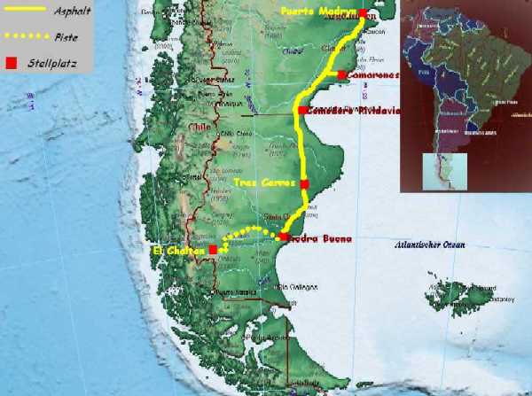 Weil wir an der Atlantikküste etwas vor der Hitze geflohen sind, sind wir etwas zu zeitig dran, um direkt Ushuaia anzusteuern. Deshalb steuern wir ein Stück der legendären Ruta 40 an, um schon ein wenig Panamerikana (Teil2) vorwegzunehmen.Wir wollen dort die Nationalparks 'Los Glaciares' (Arg.) und 'Torres del Paine' (Chile) besuchen. |