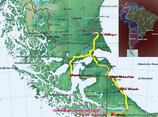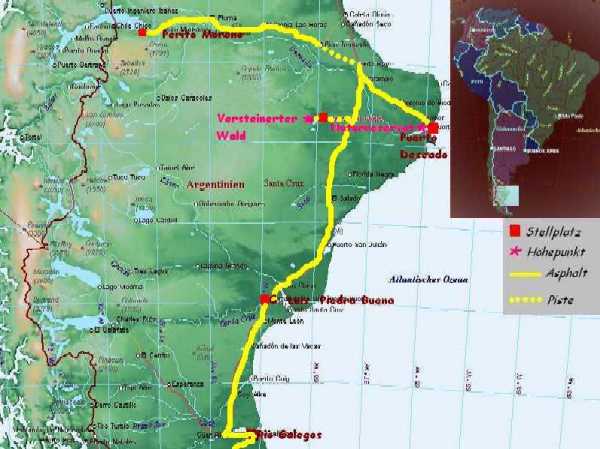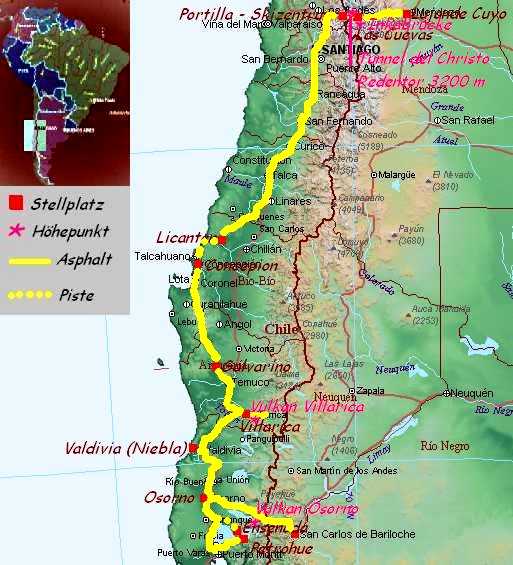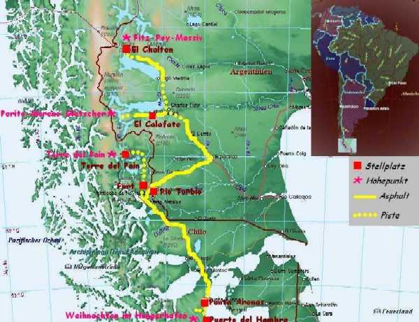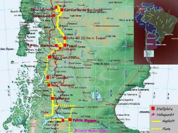 Im Winter '05 werden wir den Südamerikanischen Süden bis Feuerland befahren. Anschließend zwischen Chile und Argentinien pendelnd nach Norden. Der Süden von Südamerika ( Patagonien) soll noch sehr ursprünglich sein und viel Natur zu bieten haben - genau etwas für uns. In der Mitte wollen wir einen großen Abstecher nach Osten (Uruguai, Paraguai, vielleicht auch etwas Brasilien - ??? Carneval in Rio ???) machen. Wieder im Westen geht es nach nach Peru und Bolivien. Dort erwarten uns insbesondere die archäologischen Highlights von Südamerika - die Ruinen der Inka- und der Vorinkakulturen. Natürlich werden wir auf dem Weg zwischen diesen Stätten auch viel außergewöhnliche Landschaft sehen (wir werden die Anden auf den höchsten Paßstraßen überqueren und den Titicaca-See besuchen. Anschließend kommen wir nach Ecuador - für uns das letzte Land in Südamerika. |