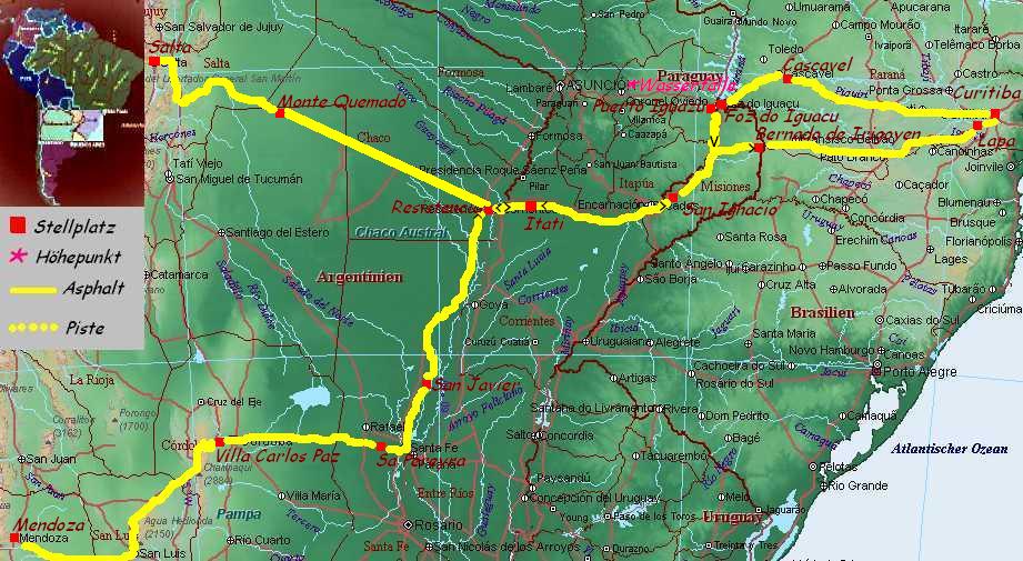 Weil am Beginn der Reise nicht die richtige Zeit für die Wasserfälle von Iguazo war, wollen wir jetzt einen riesigen Satz nach Osten machen, um diese und auch die "Missiones" kennen zu lernen. In dieser Zeit ist Karin in Brasilien (Curitiba) - also nur den Katzensprung von reichlich 600 km noch weiter östlich. - Es müßte doch mit dem Teufel zugehen, wenn kein Treffen zustande käme... Übrigens - mit dem Carneval in Rio wurde es auch nix, denn da hätten wir früher dort sein müssen. Außerdem hat man uns dringend abgeraten wg. der Kriminalität. Durch die Routenführung wurde es auch nichts mit Uruguai - aber durch Paraguai wollen wir nun noch fahren.Anschließend wollen wir wieder nach Westen (Salta) um den nächsten Abschnitt der PanAm mit der Überquerung des Passes de Jama (4200 m) zu beginnen. |