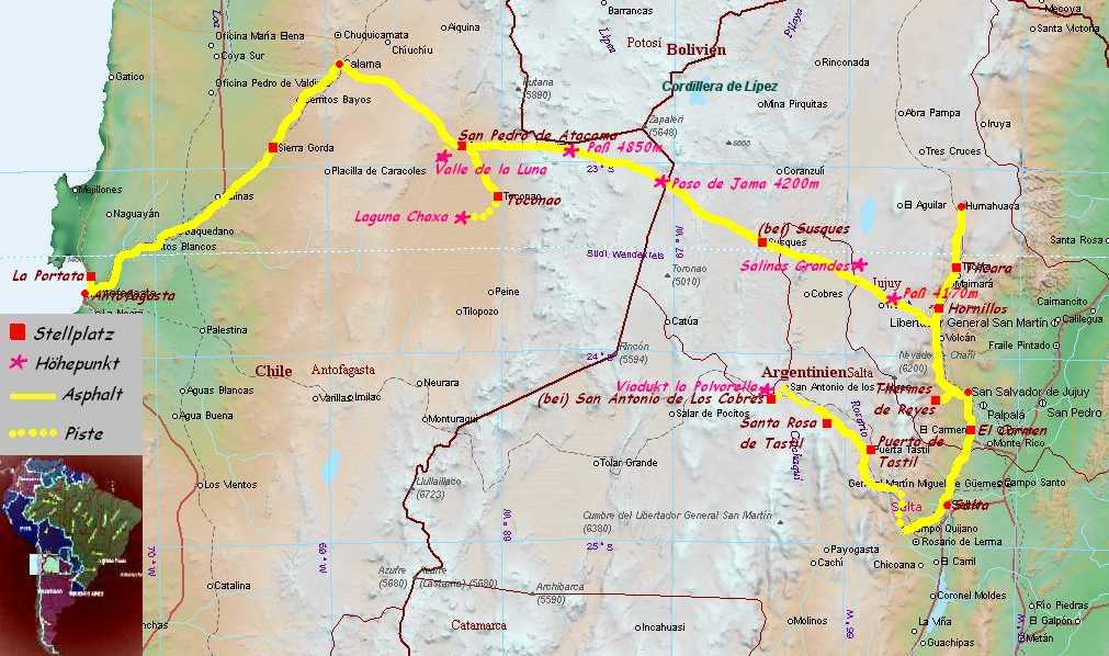 Durch Erfahrungen gewitzigt wollen wir zur Gewöhnung an große Höhen zunächst von Salta und dann von Jui-Jui aus ein paar Abstecher auf den Osthang der Anden unternehmen und dann über den Paso de Jama nach San Pedro de Atakama und uns dort in der Gegend etwas umschauen. Anschließend rollen wir wieder abwärts, um bei Antofagasta den Pazifik zu erreichen. |