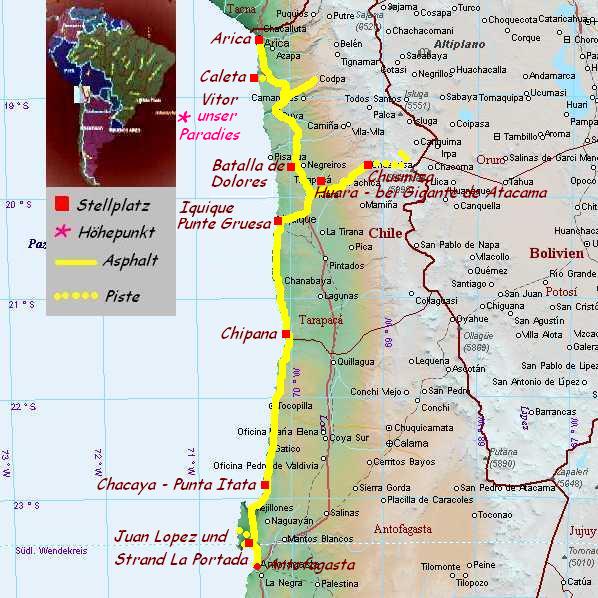 Ab hier etwa sind wir wieder in den Tropen (nördl. des südl. Wendekreises). Bei Antofagasta treffen wir wieder auf die Panamerikana (Hier in Chile Ruta 5). Durch unsere Umwege in den vorherigen Reiseabschnitten haben wir ein großes Stück ausgelassen (seit Santiago) und wollen auch jetzt bis Iquique lieber die Parallelstrecke am Pazifik fahren. Nach Iquique sind wir dann abgesehen von den Abstechern ins Altiplano und an des Meer "original Panamerikana". Nach diesem Abschnitt verlassen wir wieder die Panamerikana, um über Bolivien nach Peru zu den vielen geschichtsträchtigen Orten zu reisen |