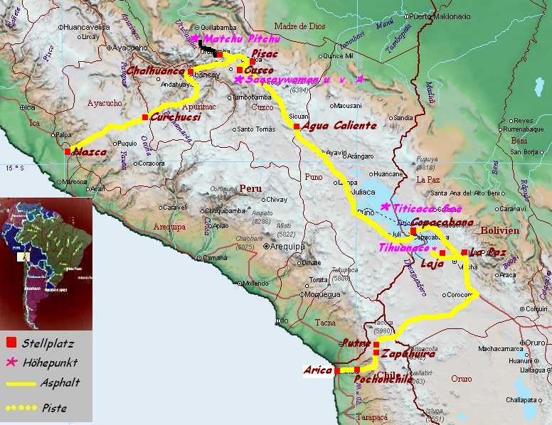 Jetzt sind die archeologischen Highlights in Bolivien und Peru im Programm. Als wir in den 70-er und 80-er darüber bei Heyerdal, Däniken und vor allem Stingl oder "Die Brücke über den Apurimac" darüber gelesen haben, hätten wir uns nie träumen lassen, daß wir das alles (und noch mit dem eigenen Auto) uns einmal im Original ansehen können. Diese Aussicht hat auch stark dazu beigetragen, daß wir aus unserer beabsichtigten Nordamerikatour die "Panamerikana" gemacht haben. Dieser Abschnitt wird also ein absoluter Höhepunkt... |