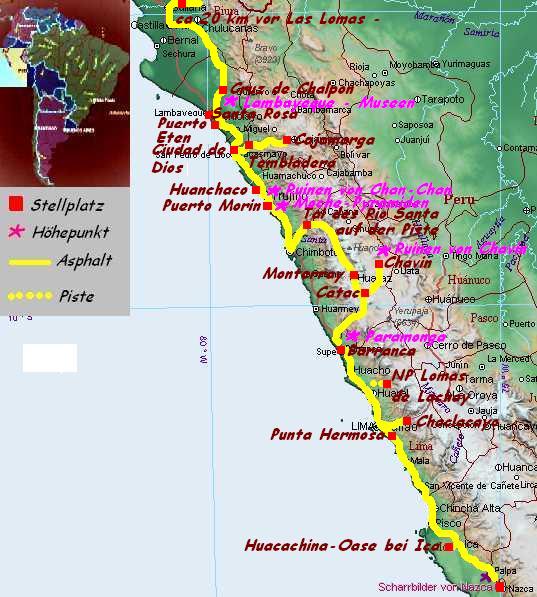 Wir wollen wieder einmal ein Stück auf der Panamerikana fahren. Aber auch hier müssen wir unbedingt nochmals einen Abstecher in die Berge machen, um die Ruinen der Chavin zu besuchen. Von dort aus wollen wir auf einem anderen Weg zur Panamerikana zurückfahren, um noch einmal thermal zu baden und durch die spektakuläre Entenschlucht und das wilde Tal des Rio Santa fahren. Ein letzter Abstecher soll uns nach Cajamarca, dem Ort, wo der letzte Inka sein Ende gefunden hat, führen. |