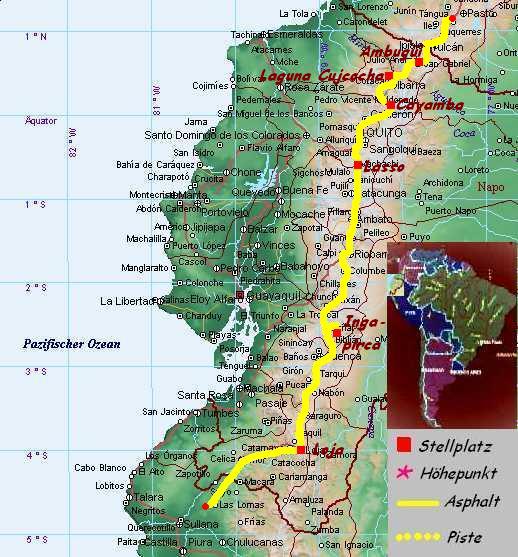Ursprünglich wollten wir ja von Ecuador / Manta verschiffen. Die Planung hat eigentlich vorgesehen, auf dem kürzesten Weg nach Manta zu kommen. Da hätten wir aber Einiges verpaßt. Da wir nun aber ganz anders nach Mittelamerika kommen wollen (s. nächster Abschnitt), hat es sich so ergeben, daß wir in Ecuador wirklich auf der Panamerikana Richtung Kolumbien fahren. Die Strecke ist sehr gebirgig und verläuft auf mittleren Höhen (südamerikanisch, versteht sich, also meist zwischen 1000 und 3000 m), so daß wir trotz Äquatornähe mit erträglichen Temperaturen rechnen können. |