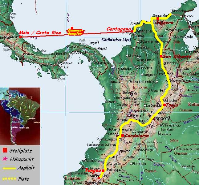 Man hat uns viel wegen der Gefahren in Kolumbien, besonders um Medellin herum, gewarnt, sodaß wir unsere Route trotz Umweg über Bogota geplant haben. Sonst gilt aber auch hier, daß wir keine weiteren Kringel machen wollen - auch wg. der bereits gebuchten Passage. Alle nach der Durchquerung übrige Zeit wollen wir am karibischen Meer möglichst in Ruhe verbringen... |