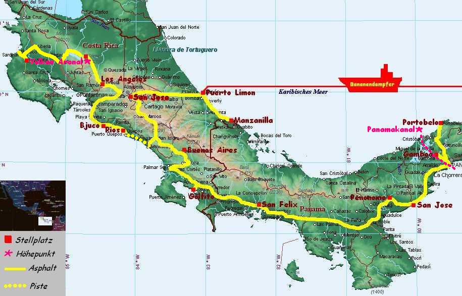 In diesen Ländern wollten wir uns lt. Plan nicht lange aufhalten und sind auf einen längeren Aufenthalt nicht gerüstet (touristische Informationen,Reiseliteratur). Nur , weil unser Terminplan etwas durcheinander geraten ist, müssen wir hier noch wenigstens 4 Wochen "schinden". Costa Rica wird auch "die mittelamerikanische Schweiz" genannt. Außerdem scheint es von allen mittelamerikanischen Ländern das sicherste zu sein. Deshalb wollen wir uns hier (entgegen der ursprünglichen Reiseplanung) ausgiebig umsehen. Ein Abstecher zum Panamakanal ist sicherlich interessant und außerdem lernen wir ein Stück Panamerikana kennen, das uns sonst entgehen würde... . |