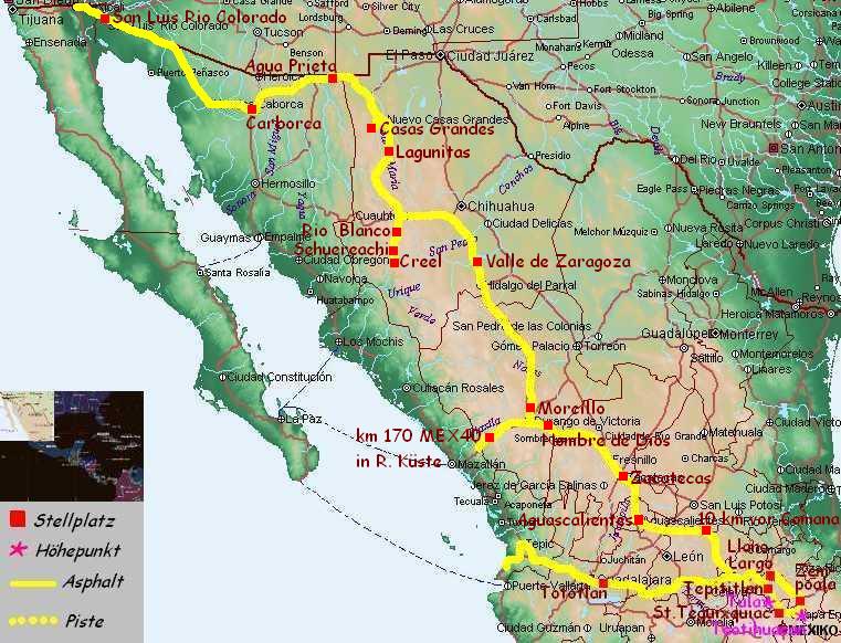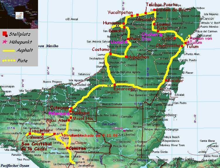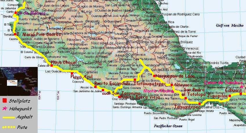 Eigentlich ist der äußerste Süden der PanAm in M. schon im vorhergehenden Abschnitt enthalten - aber wir nehmen es nicht so genau. Nach unserer ursprünglichen Planung wollten wir in diesem Abschnitt im Land bis nördlich Mexiko-Stadt fahren, um die dortigen Sehenswürdigkeiten noch "mitzunehmen"; dann an die Pazifikküste (wieder südlicher) und dann bis zur günstigsten Fährverbindung (das wäre Guaymas) zur Baja California - dort begänne der nächste Abschnitt. |