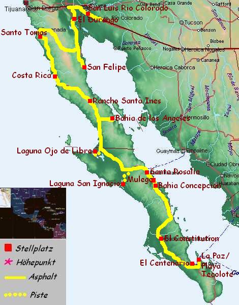 Der letzte Abschnitt unserer Reise in Mexiko ist die fast Straßen-2000 km lange Halbinsel Baja California. Für uns werden es also auch etwa doppelt so viel km sein (zur Erinnerung: wir haben auf die Fähre verzichtet. Die Meinungen über dieses Stück Mexiko gehen sehr weit auseinander - wir sind gespannt... . |