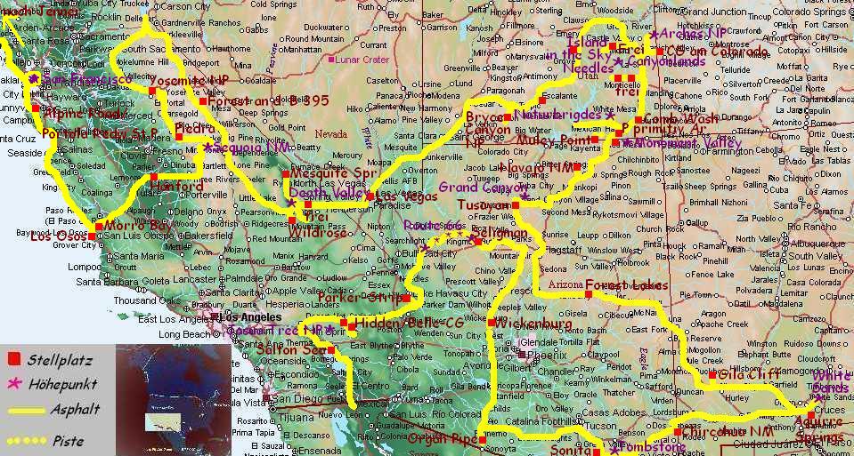 Einerseits wird es Ende Februar weiter im Norden noch recht kalt sein und andererseits müssen wir aber weiter. Wir wollen immerhin auch von Nordamerika noch Einiges sehen und auch zwei Jahre sind 'mal zu Ende. Es gibt ja in "Gods owen Country" gerade in dieser Ecke so wahnsinnig viel Nationalparks, -monuments, Stateparks, Nationalforests, Wildernesses und Indian Reservationes, sodaß man sich dafür schon einige Zeit nehmen muß. Wir haben uns ersteinmal die südlichen und niedriger gelegenen in Californien, Arizona, Colorado, New Mexiko, Utah und Nevada ausgesucht und wollen uns dann weiter "hocharbeiten"... . |