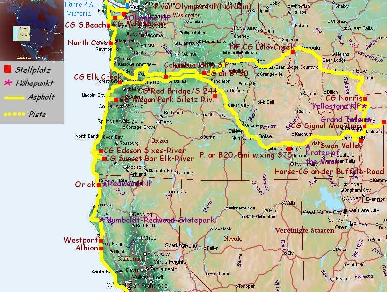 Ursprünglich war geplant, außer Oregon und Washington auch Idaho, Wyoming und Montana zu bereisen. Aber einerseits wird die verfügbare Zeit knapp und andererseits haben wir schon im Yosemite NP und im Sequoia NM festgestellt, daß das Jahr für solche Besuche noch "zu jung" ist. Das würde für den Yellowstone NP einschließl. Teton und Glacier NP im verstärkten Maße zutreffen. Wir werden uns deshalb nur auf den äußersten Westen beschränken. Es wird uns auch leider nicht gelingen, auf der Rückreise von Alska einiges nachzuholen. (Dann ist im Yellowstone Hochsaison - und wir haben keine Lust, nur im stop and go den Park zu durchqueren) . Schade! |