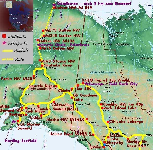 Thematisch geht unsere Reise in diesem Abschnitt zu Ende. Wir wollen die übliche Runde in Alaska fahren (Anchorage mit Abstecher zur Kenai - H. I.; vorbei am Denali-NP nach Fairbanks; von hier aus einen Abstecher auf dem Dalton-Hwy. nach Deadhorse; wieder nach Süden Richtung Whitehorse, mit Umweg über Dawson City). |
