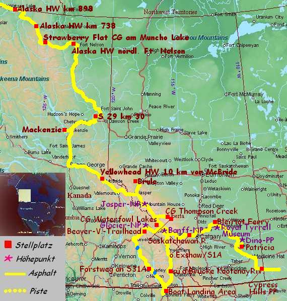 Wir wollen, um nach Alsaka zu kommen, die westlichste Route fahren, an der auch die meisten Sehenswürdigkeiten liegen. So lassen wir den "Transcanada-Hwy" rechts liegen, fahren auf dem Caribu-Hwy bis nach Prince George, anschließend auf dem Yellowhead Hwy nach Westen (eigentlich bis zur Abzweigung nach Steward - aber als Abstecher außerdem noch durch das Skeena-River-Tal). Über Steward (und Hayder) geht es weiter nach Watson Lake, wo wir auf den Alaska-Hwy stoßen. Natürlich gibt es noch weitere Abstecher, die aber noch zu planen sind. |