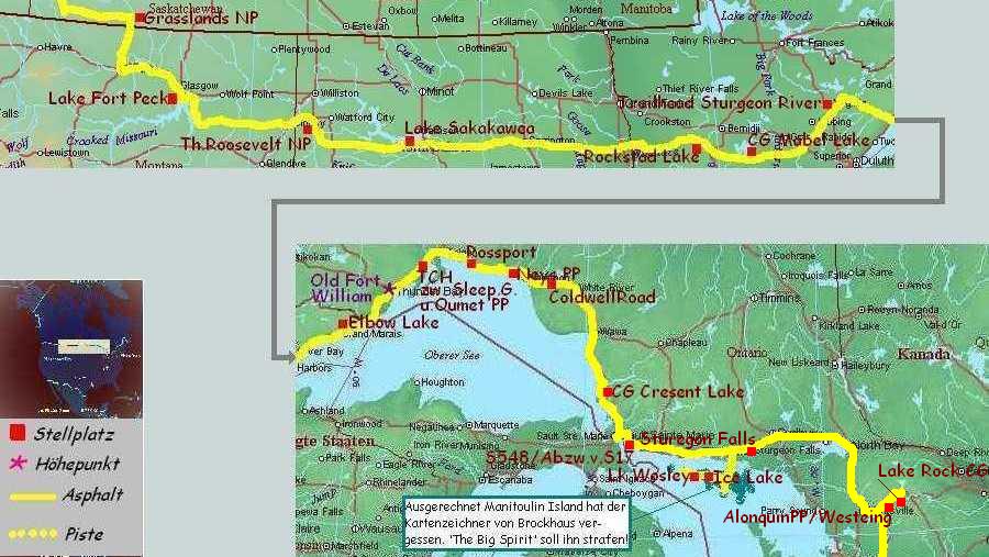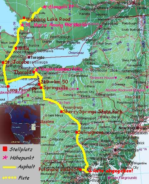 Nach neuester Planung - und mittlerweile auch mit 2. Aufenthaltserlaubnis USA und gebuchter Rückreise abgesichert - wird es Ende September von Baltimore/Maryland nach Hause gehen. Nun wendet sich unsere Reise endgültig nach Osten. In diesem Abschnitt entlang der Grenze Kanada/USA nach Osten bis zu den Großen Seen. Nach den reichen Höhepunkten dort steuern wir im nächsten Abschnitt Richtung Südosten Baltimore an. Wie es dann vielleicht noch weiter geht, wollen wir erst verraten, wenn die Planung so weit fortgeschritten ist... . |