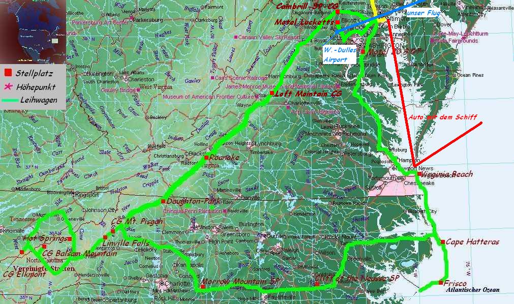 Als wir uns entschlossen hatten, nach Abgabe unseres Wohnmobiles noch solange in den USA zu bleiben, daß wir nach dem Heimflug unser Auto gleich wieder abholen können, dachten wir daran, noch ein paar Highlights nachzuholen. Da wäre zu nennen: Florida mit Key West, Nashville/Tennessee als Country-Music-Liebhaber oder/und "Old Man River" Missisippi. Da aber die letzten Monate bis zum letzten Tag etwas stressig waren, fällt nun unser Plan wesentlich bescheidener aus:Wir wollen nur etwas Urlaub von der Reise machen und erst am Atlantik (Outer Banks / Virchinia; North Carolina und dann den Blue Ridge Parkway, der den Smoky Mountens-NP mit dem Shennandoah-NP verbindet abfahren.Wir hoffen, daß das die richtige Wahl ist. |
